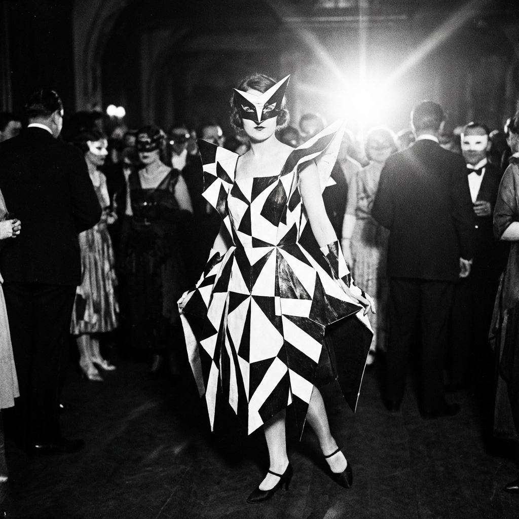 Avant-garde artists and socialites arrived in black-and-white geometric costumes that turned the ballroom into a living optical illusion. This moment marked the transition of Dazzle from a survival tactic to a high-fashion statement.